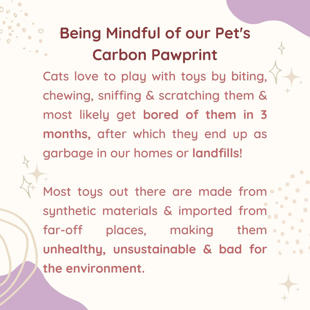 Our cats love to play with toys by biting, chewing, sniffing & scratching them & most likely get bored of them in 3 months, after which they end up as garbage in our homes or landfills! Most toys out there are made from synthetic materials & imported from far-off places, making them unhealthy, unsustainable & bad for the environment.