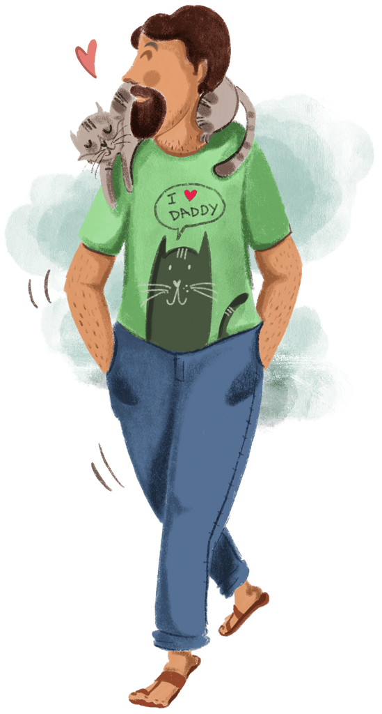 Is it the nonchalance of a cat dad that cats find so appealing? Or maybe its the extra treats they get. Or perhaps, it's just the stubble!
