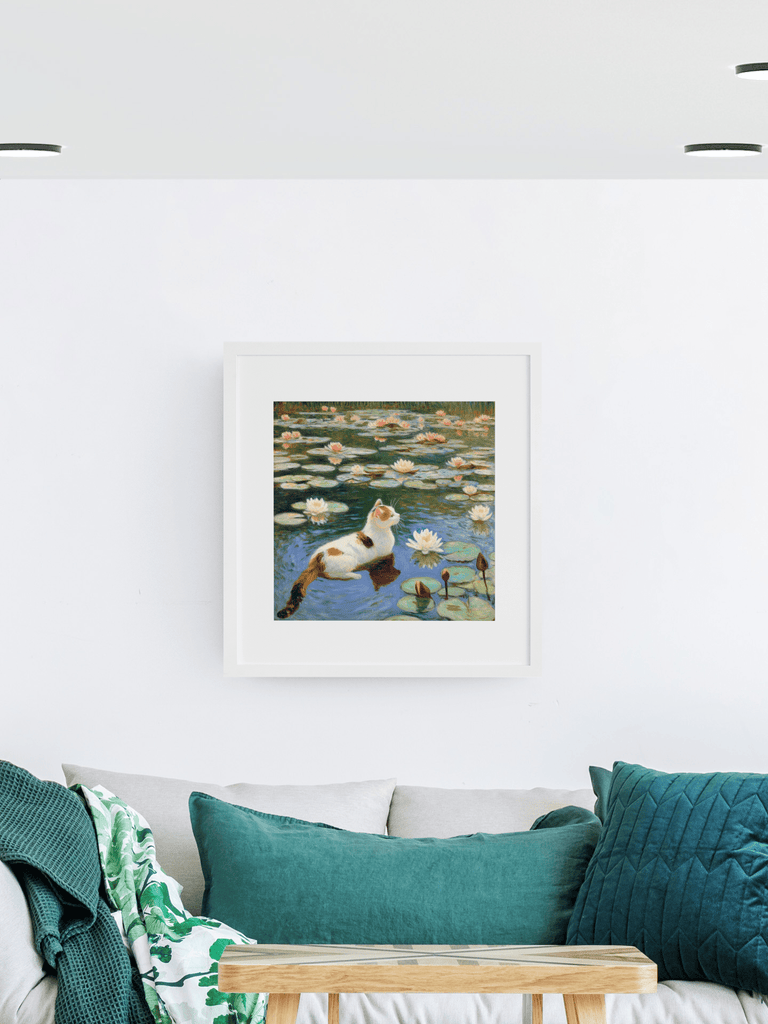In 1893, Monet, who loved plants & gardens, purchased land with a pond and created a water lilly garden, near his house in Giverny, to spend time painting the landscapes. While his Water Lillies series has approximately 250 oil paintings, it is said that Monet kept his most favourite paintings for himself, including this one where a nonchalant white cat with ginger markings seems to be contemplating the more profound aspects of life amidst the water lilies.