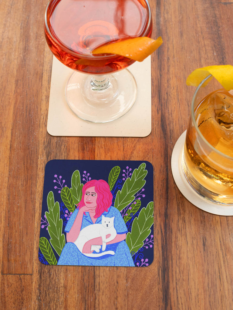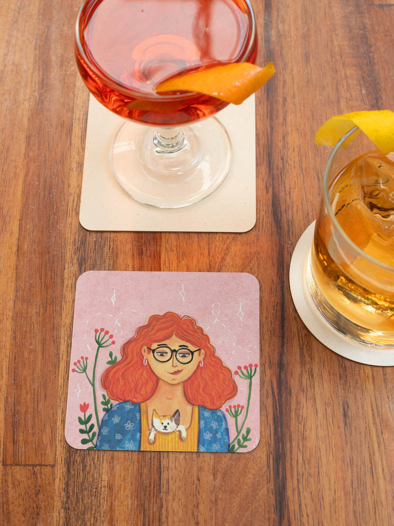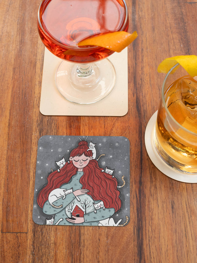 3.5 inch MDF coasters with playful cats illustrated by Shikha Nambiar