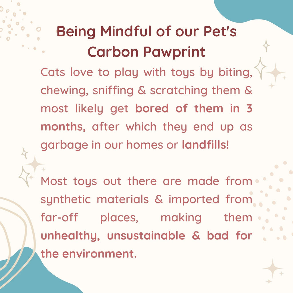 Our cats love to play with toys by biting, chewing, sniffing & scratching them & most likely get bored of them in 3 months, after which they end up as garbage in our homes or landfills! Most toys out there are made from synthetic materials & imported from far-off places, making them unhealthy, unsustainable & bad for the environment.