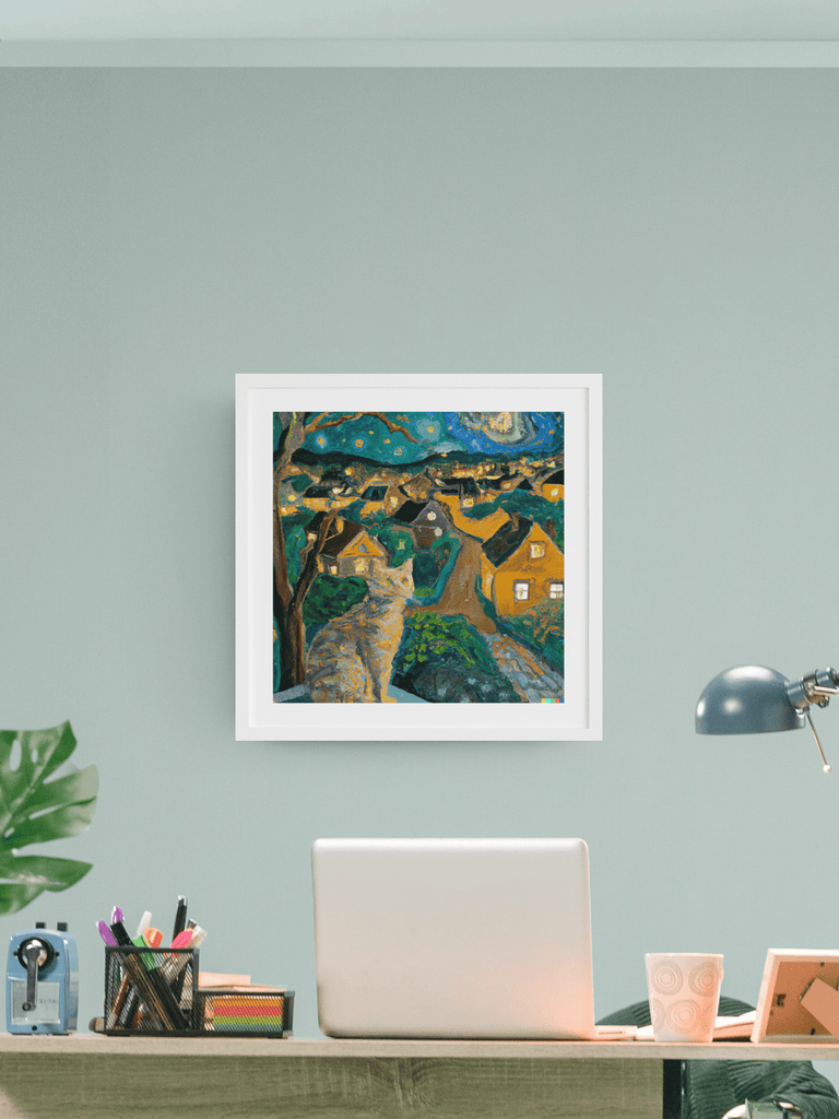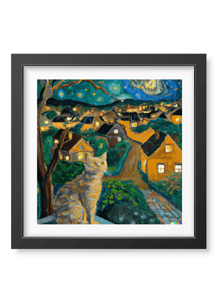A ginger cat overlooks a quaint countryside village at dusk as he makes plans to tackle the mice he last spotted near the village pub. Amidst the plan making, he can't help but look in wonder at the starry sky above with twinkling stars and swirling clouds, gaining visibility against the darkening skies. Something about the starry night reminds him of a painting he once saw.