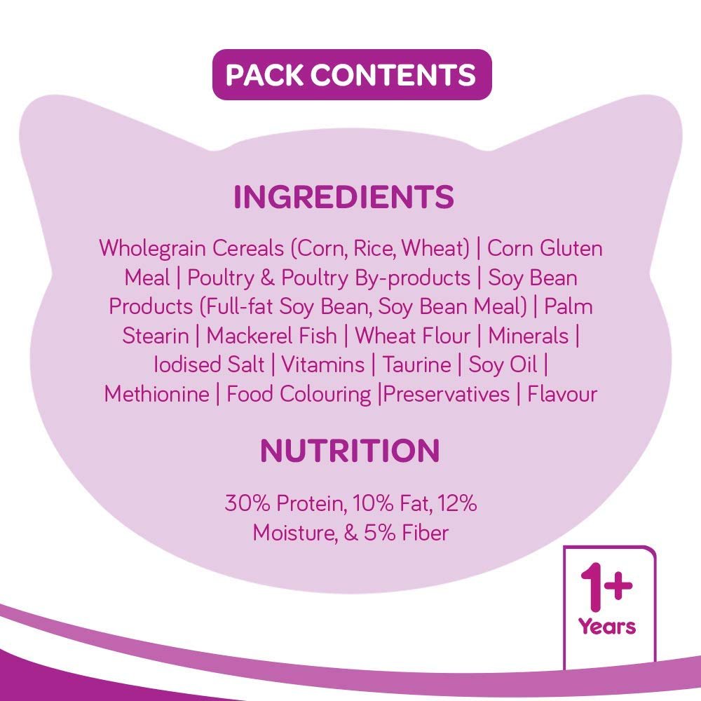 Whiskas® Mackerel cat food is a nutritionally complete and balanced recipe that has carefully been created to cater to the requirements of an adult cat’s system. Flavorful pockets, filled with not only the best tuna and poultry ingredients but also loads of other essential nutrients that will help your cat lead a healthy, active and long life.